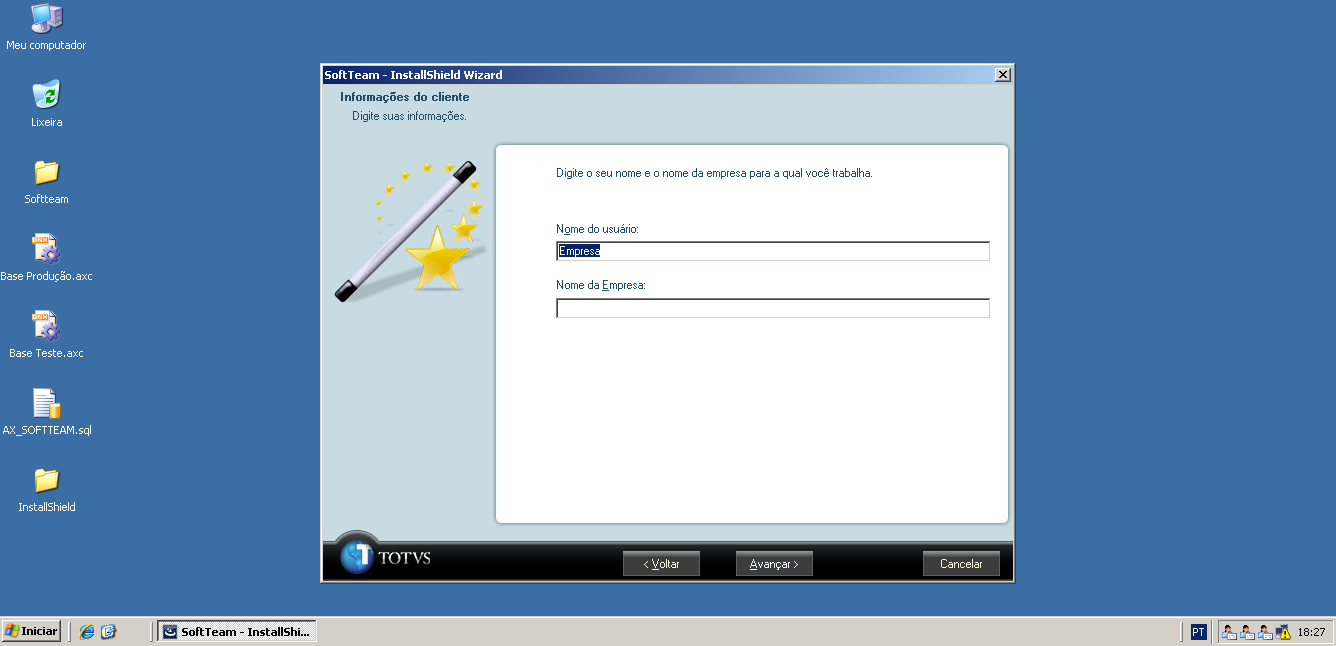 O próximo passo e digitar o nome da empresa e nome do usuário.